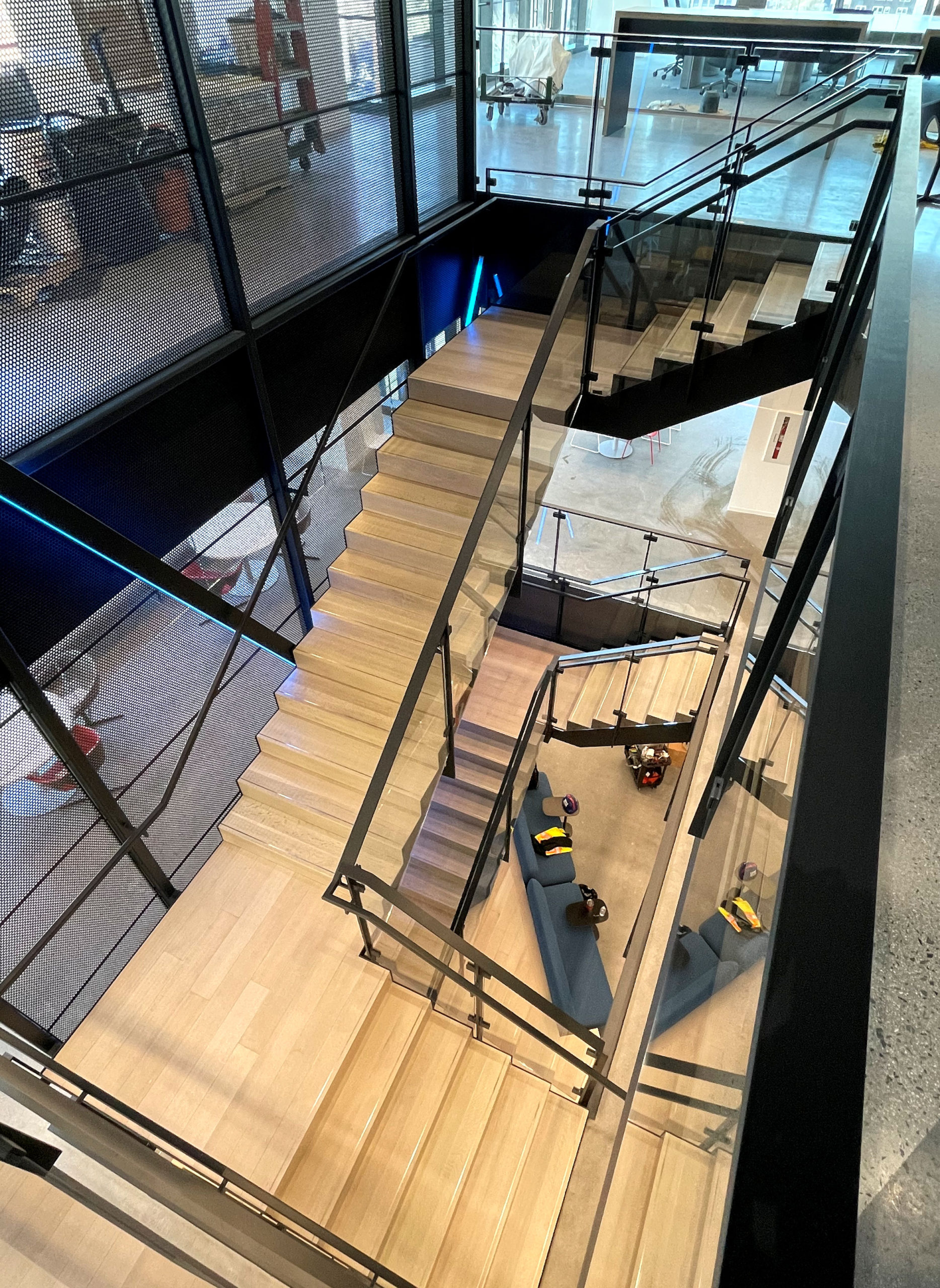 This 3-level feature staircase in the new offices for Fox 5 WTTG (Washington, DC) allowed Emerald Ironworks to showcase some skills including precise structural steel fabrication/erection, innovative design (notice how the HSS stringers look like seamless built-up box stringers), waterjet saw tooth tread closures, successful glass design and install, and even a custom LED light track!